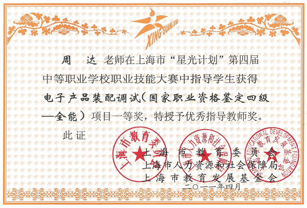 周达是智能工程系电气运行与控制专业实训教师,电气实训组组长,职业资格等级电工技师。他在上海市“星光计划”第四届中等职业学校技能大赛中指导学生荣获电子产品装配调试项目全能一等奖,被组委会评为优秀指导教师。