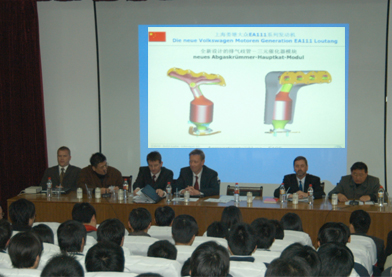 大众动力总成公司总经理柯赫、生产经理霍夫迈斯特、质量经理柯乐等6位专家分别介绍了大众发动机三厂建设情况及人员需求、新工人培训,严格质量控制等情况,用生活中的实例,深入浅出诙谐、明了地阐明了质量的重要性。柯乐先生特别指出:大众为何汽车质量能闻名于世,位于世界领先地位,就是因为大众厂有严格的质量控制,全体员工视质量为企业的生命线。同时,专家们非常直率地说,如果要到德资企业工作,就必须从现在开始做任何事情都要有强烈的责任性和质量意识。期间,前进分院毕业班学生用德语与德国专家进行探讨,气氛活跃、热烈,有力地推动了学生德语学习的积极性。同学们纷纷表示要学好德语,打好基础,练就扎实功底,为适应德资企业的需求而努力奋斗。
