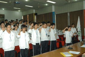10月12日下午,在学校阶梯教室举行青年志愿者的上岗仪式。志愿者服务队队长尉晓东代表全体志愿者发了言,表了决心,并带领全体志愿者庄严宣誓,梁桦副校长在仪式上向队长授队旗,并提出了要求。