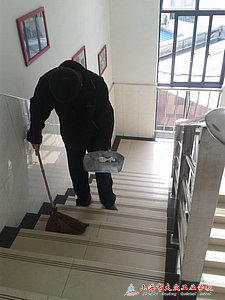 志愿者们分工明确,活动在大家的积极参与中有序地展开了。每个层面都有志愿者在打扫:有的在楼层的走道里不顾寒冷拿着湿冷的抹布,毫不懈怠地擦着瓷砖;有的拿着扫把在楼梯口一级台阶一级台阶地扫着垃圾;还有的在教学楼外的相关区域里弯腰捡垃圾;甚至还有其他不是志愿者队的学生看到志愿者的行为,深受感染,主动提出要帮忙一起打扫卫生。就是因为文科部这些学生们的配合,即使只是一停足、一挪步,使卫生打扫的工作更加顺利。