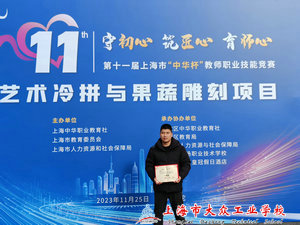 根据大力弘扬工匠精神,坚持“面向社会、面向青年、面向技能”的竞赛宗旨,为具有艺术冷拼与果蔬雕刻的技能型人才搭建展示技艺的平台,提供切磋交流的载体,营造崇尚技能、匠心筑梦的良好社会氛围,2023年11月25日,由上海中华职业教育社、上海市人力资源和社会保障局、上海市教育委员会主办、上海市曹杨职业技术学校承办的第十一届“中华杯”艺术冷拼与果蔬雕刻项目竞赛,我校青年教师杨广老师经过精心设计,巧手雕刻,喜摘一等奖。