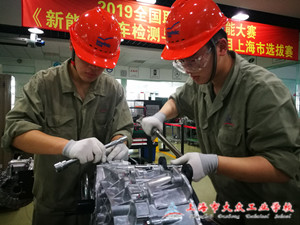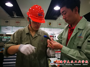 我校汽车工程系周震霆和傅圣剑两位学生在指导老师黄月华和梁秀亮的带领下,参加了此次比赛,学校党总支副书记杨建英、汽车工程系主任徐剑共同前往为选手加油鼓劲。前期指导教师与参赛选手在没有设备的条件下,克服种种困难,不分昼夜,每天奋战十几个小时,以实训室为家,为备战比赛付诸了大量时间和精力。比赛现场如真实工作情境,高手如云互不相让,分秒必争,设备检查、车辆检查、检测高压电系统断电及绝缘体检测等比赛规定动作一气呵成,而我校的两位选手凭借扎实的专业功底、淡定的比赛心态从容应战,最终有惊无险收获一等奖殊荣。