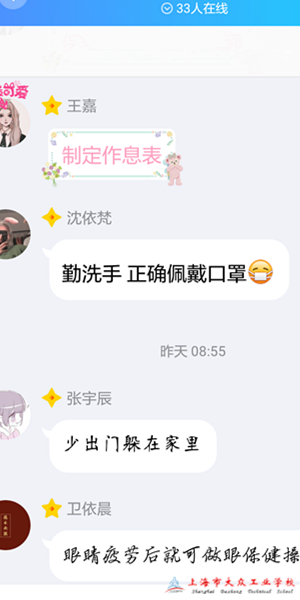 本周二2月25日上午8:20,全系师生通过有线电视或上海微校的“空中课堂”等多渠道进行了观看。虽然时间只有短短的20分钟,但是师生们从专家的讲解中增强了许多防疫知识和意识,培养了良好的卫生习惯。直播结束之后各班班主任还通过班级群组织学生交流互动,大家畅所欲言,纷纷表示要少出门,勤洗手,正确佩戴口罩,多开窗通风,保持良好的作息习惯,制度作息表等等。
