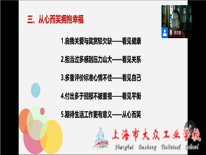 暑假期间,在继续做好疫情防控工作的同时,程春红名师培育工作室学员们不忘利用暑期充电,提升自身素养,继续开展线下线上的研训活动。2020年8月18日,工作室学员们聆听了由上海市教委中职颜苏勤心理健康名师培育工作室主持人颜苏勤老师主讲的“名师学员幸福感提升路径——基于微笑主义吾脑理论的思考”线上主题讲座。