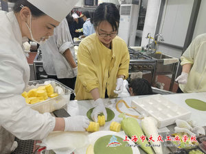 金黄酥脆、绿油鲜亮的饼皮,绵密细腻的奶油、丰富多样的水果、五颜六色的巧克力……烹饪实训中心早已准备好齐全的工具和新鲜的食材。烹饪专业教师们开始了示范讲解,每一个步骤都讲解得细致入微。老师们围在操作台前,认真聆听讲解,眼神中满是专注与期待。大家纷纷动手尝试,摊饼皮时的小心翼翼,调配奶油时的精准用量,自由点缀鲜果时的创意无限,每一个动作都饱含着对美食制作的热情。