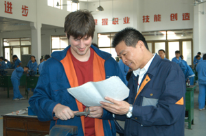 从一开始进入车间,他们就力求和大众工业的其他学生一样,身着工作服、穿好工作鞋,尽量遵守车间的作息制度……他们的悟性很高、动手能力很强,最主要是十分刻苦和认真——两兄弟十分守时、说一不二,自清晨他们从市中心开车来学校,他们就一直“扎根”在机床前;车间的带教师傅不提醒他们,他们就一直干下去。他们不但守时守信还为求完美,目标就是要把工件做到精益求精。此外,在语言交流方面师傅和二位同学之间虽然有一点障碍,但专业的翻译和耐心的师傅都让这些问题迎刃而解了。