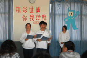 主持人的随机应变,多媒体的播放设计,节目的衔接串联,都由087C2班的学生亲自参与,独立完成。两位优秀的主持人,男生高鑫磊、女生陶生,清晰的吐字、流畅的串词,都给在座的老师同学留下了深刻的映象……接着,有着“青藏高原”般嗓音的马永亮带领的诗朗诵《文明迎世博》更是慷慨激昂;随后,学生原创的情景剧《课间十分钟》,采撷了日常学习生活中的两种行为的“对比画面”,将不良陋习和良好习惯作对比,给大家留下了反思和质询的思考空间……