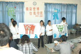 从一开始的“文明礼仪知识连连看”开始,就有了师生互动环节的激发,随后的击鼓传“海宝”,要求学生打击铜鼓,手里传到海宝的老师或学生,共同参与,说说世博会我们应该付出的力量和奉献的责任,参与的老师有一大半抒发了自己的感想,与学生的见解碰撞出了许多理性的火花;最后的“绘就世博蓝图”,更是邀请了陆浩勤校长、练子飞主任、