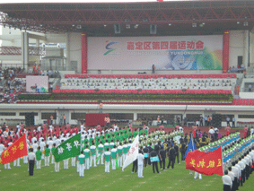 今天是上海市嘉定区第四届运动会的开幕,我们大众工业学校的一部分同学,冒着酷暑来到嘉定体育馆门口,才知道原来嘉定的体育馆如此的蔚为壮观——我很惊讶的来到体育馆里和住宿的同学一起落座。环视体育馆里的人,几乎座无虚席,作为一个嘉定人民我感到无比的骄傲和自豪……