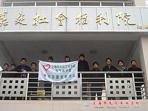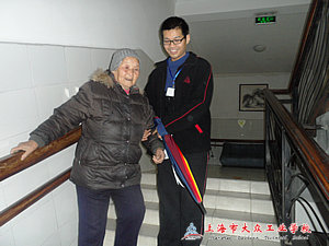 一位老人蹒跚扶着栏杆上楼梯,一步一步一步,平常人做到很简单,但对他们来说是不容易的。就在这时,其他小组的成员冲上前去,帮着老人扶着老人,一起走上楼梯,传递自己的爱与温暖。