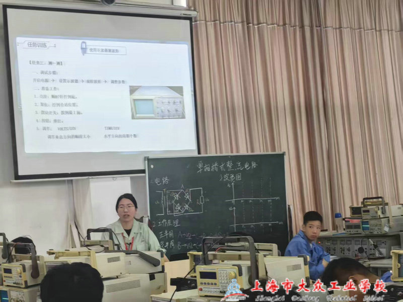 徐安冉的《单相桥式整流电路》在11-303实训室开课。教师手持一个手机充电器,并PPT图片展示其内部电路图,引导学生观察思考来引入课题;在通过NI Multisim 软件仿真单相半波及桥式整流电路,采用对比法引导学生观察输出电压波形特点使抽象电路能够直观呈现,帮助学生建立感性认识,降低理解难度;从而激发学生主动探索分析电路工作原理,实现知识内化;在实操环节教师通过测一测、练一练、调一调三个任务,串联“原理→计算→实操”,强化系统性认知达到知识链整合;融合万用表、示波器操作,突破波形观测难点,实现学生多技能协同。